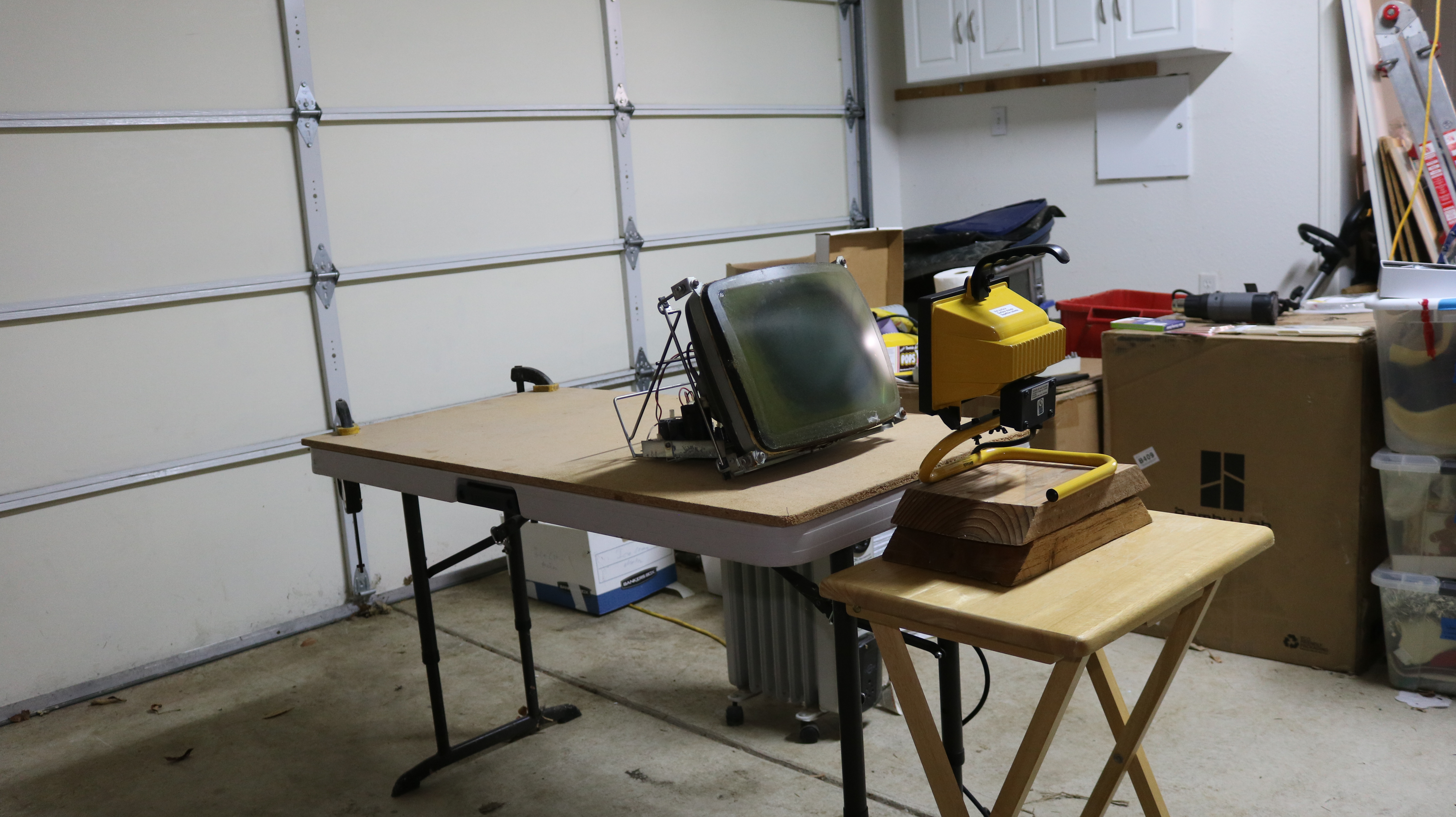 In most of the videos I watched, the CRT was removed from the monitor and placed vertically in something like a metal pail (with rags for insulation). My situation is a little unique in that you can see I left it mounted in the monitor frame. The design of the convergent monitor facilitated this because the tube mounted to the frame — many tubes aren’t like this. You’ll have to evaluate the process for your specific tube.