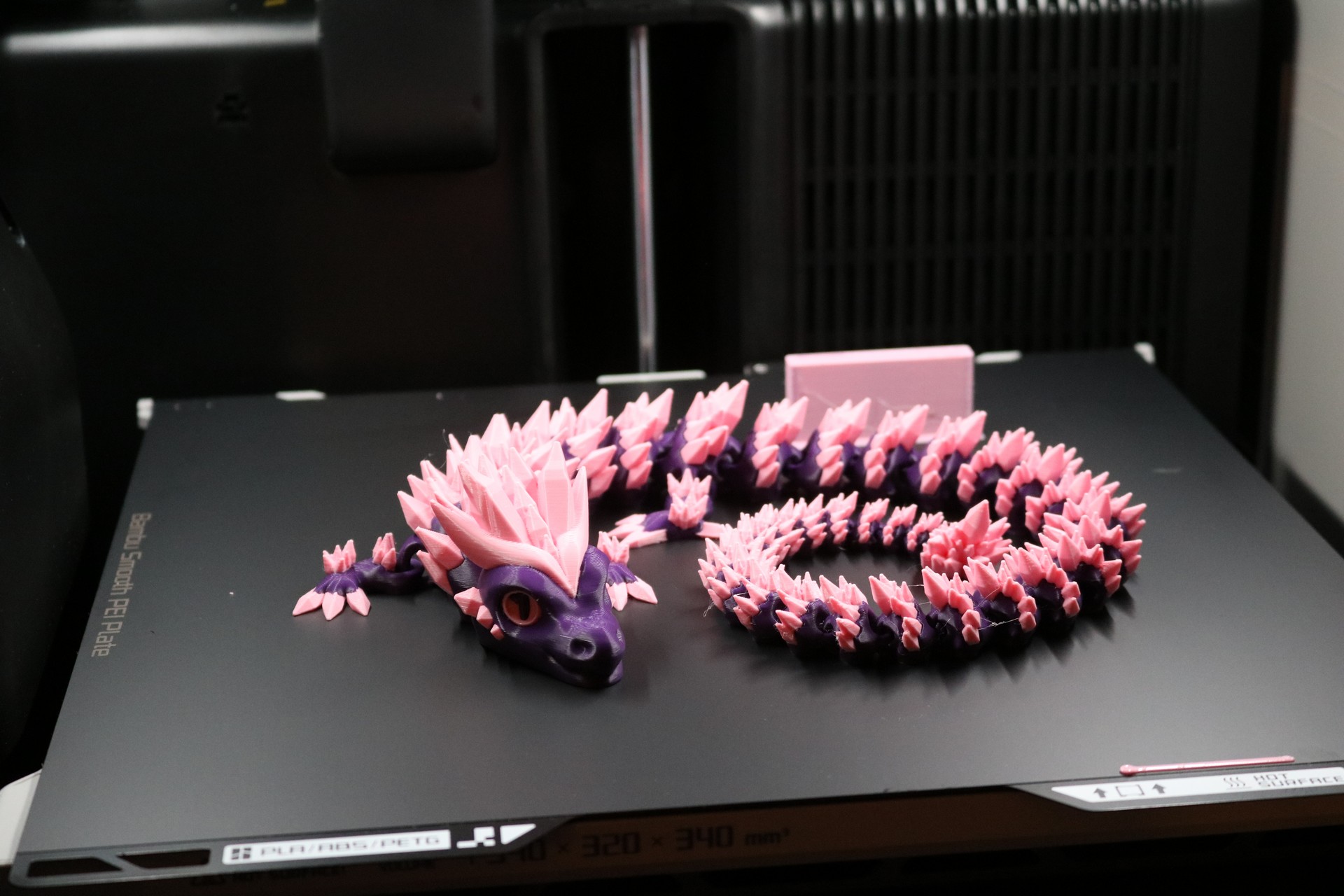 Our first flexi-dragon. These are flexible dragons that print in place. I believe this one was by Saber3D: