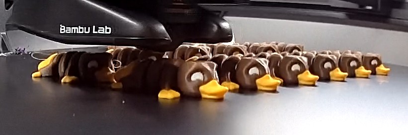 The key point is to either design your model so it minimizes layer changes, or to print several models in parallel. For example, this plate of 3-color platypuses required 64 color changes, but they were amortised across 12 models, leading to only about 17g of wasted filament.