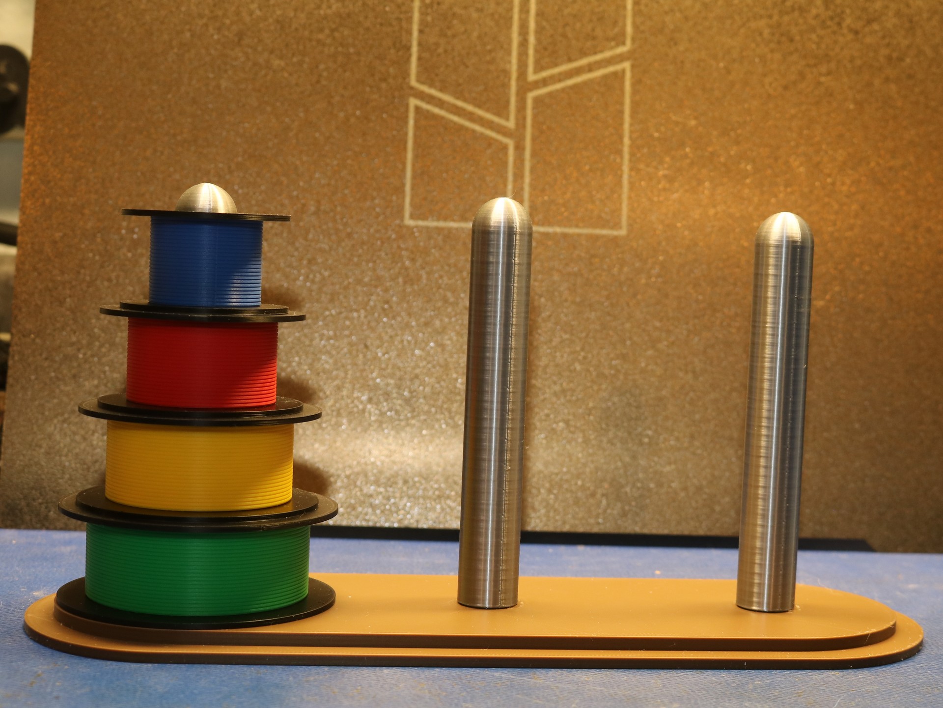 A 3D printed Towers of Hanoi Game (designed by me). Find it on Makerworld. I used a variety of PLA filaments, including silver silk.
